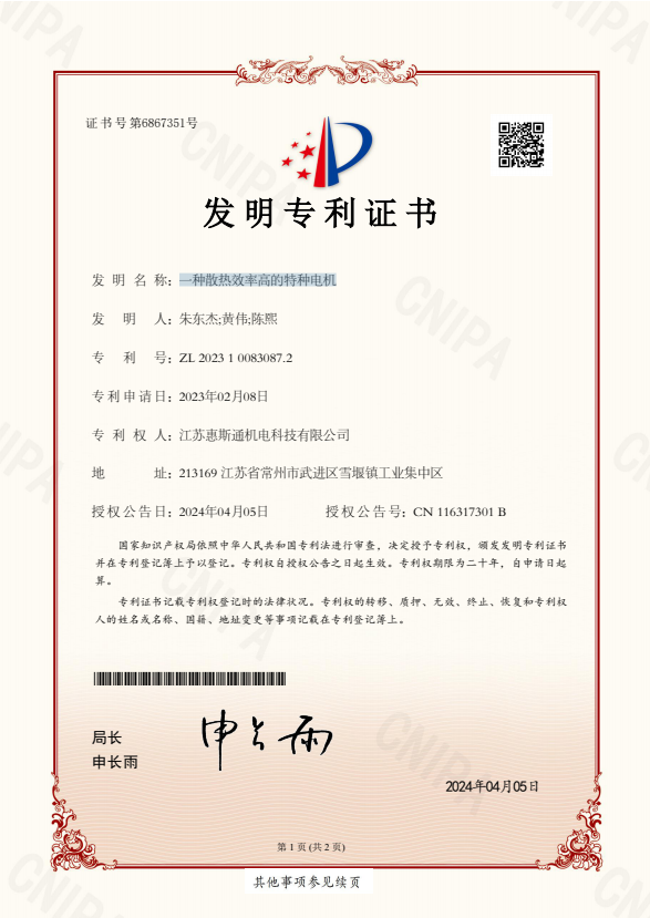 1種散熱效率高的特種電機發(fā)明專利證書